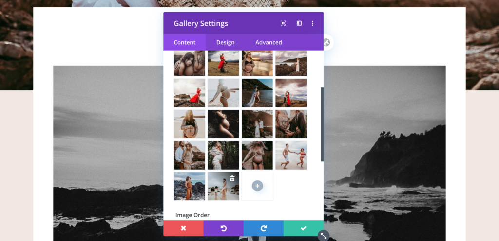 8. To change a ‘gallery’ module where you may have a slideshow of images. Follow the above steps. When the image gallery module window opens, you will be given the choice to add images with the + at the bottom of the image thumbnails. You can delete images by hovering over the desire image and click the ‘trash’ icon. You can rearrange by simply dropping and dragging. Please note: it is also advised to stick to the same orientation as the existing images.